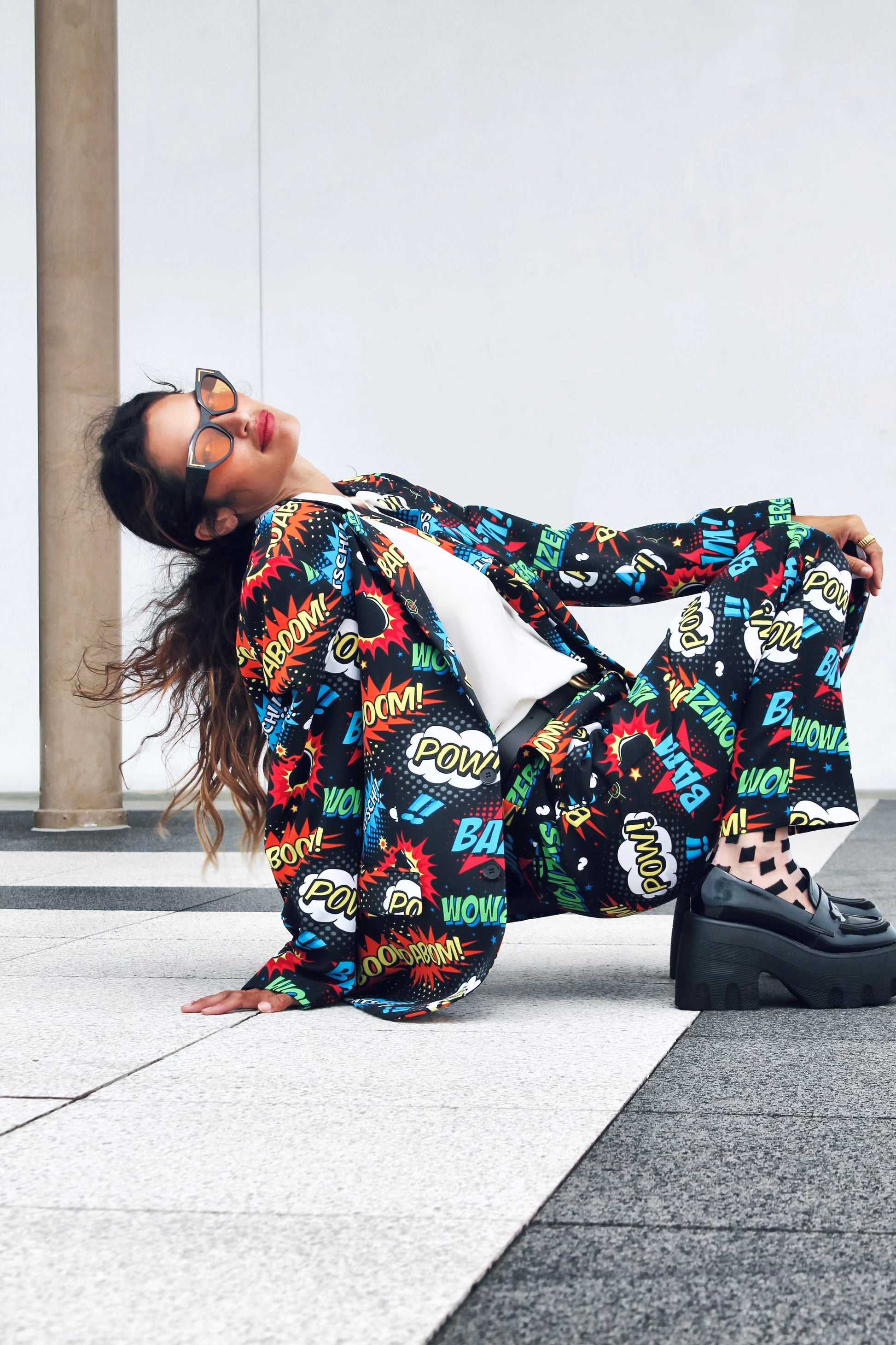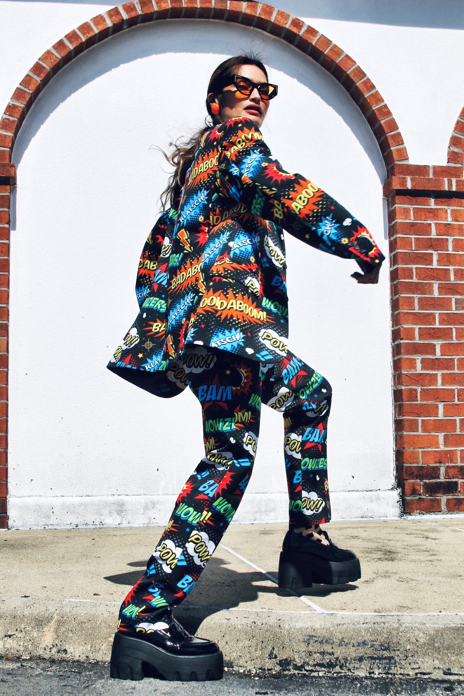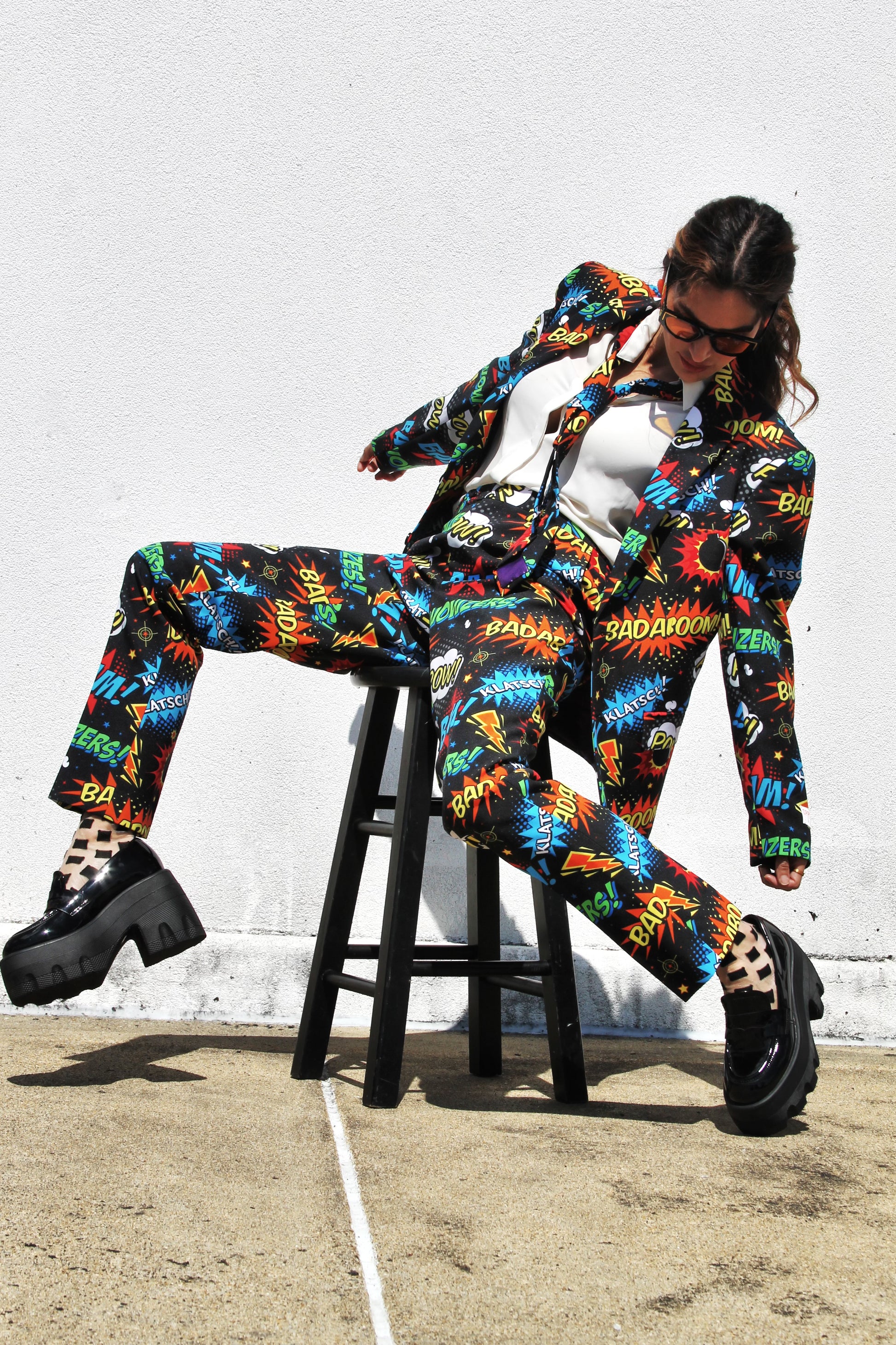 Outfit: LOUD. Mood: FUN. Planet earth: Officially her runway 😜 A walking explosion of attitude 💥 these Pop Art slacks are a wink to the days when heroes wore capes and colors didn’t hold back. Bursting with vintage “KABOOM” and “POW” graphics in electric primaries- she’s a wearable comic strip that screams confidence -> drenched in creativity. Her sharp tailoring keeps it sleek, while the riot of color gives her pure hero energy- fashion’s answer to a superhero’s call 🤩