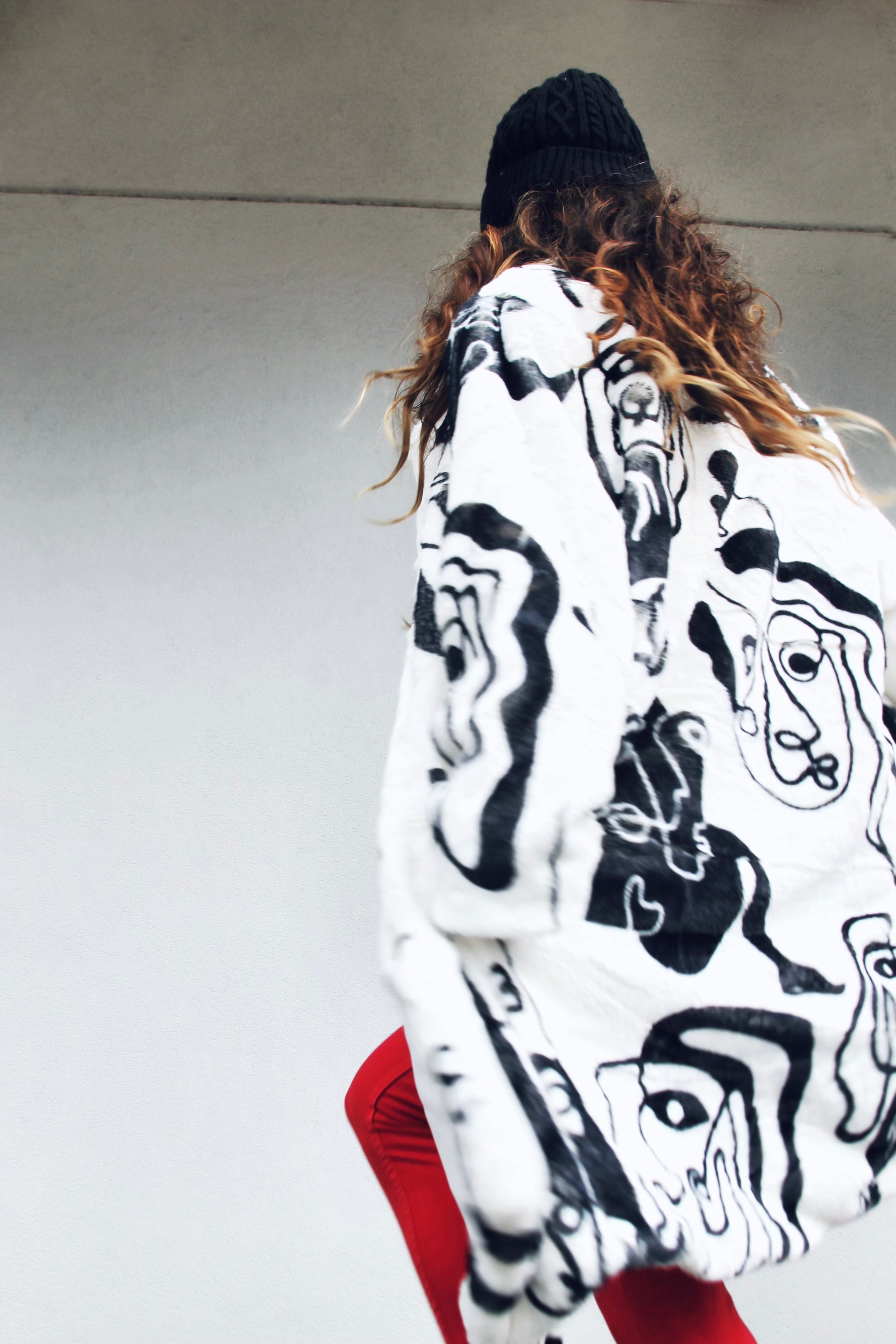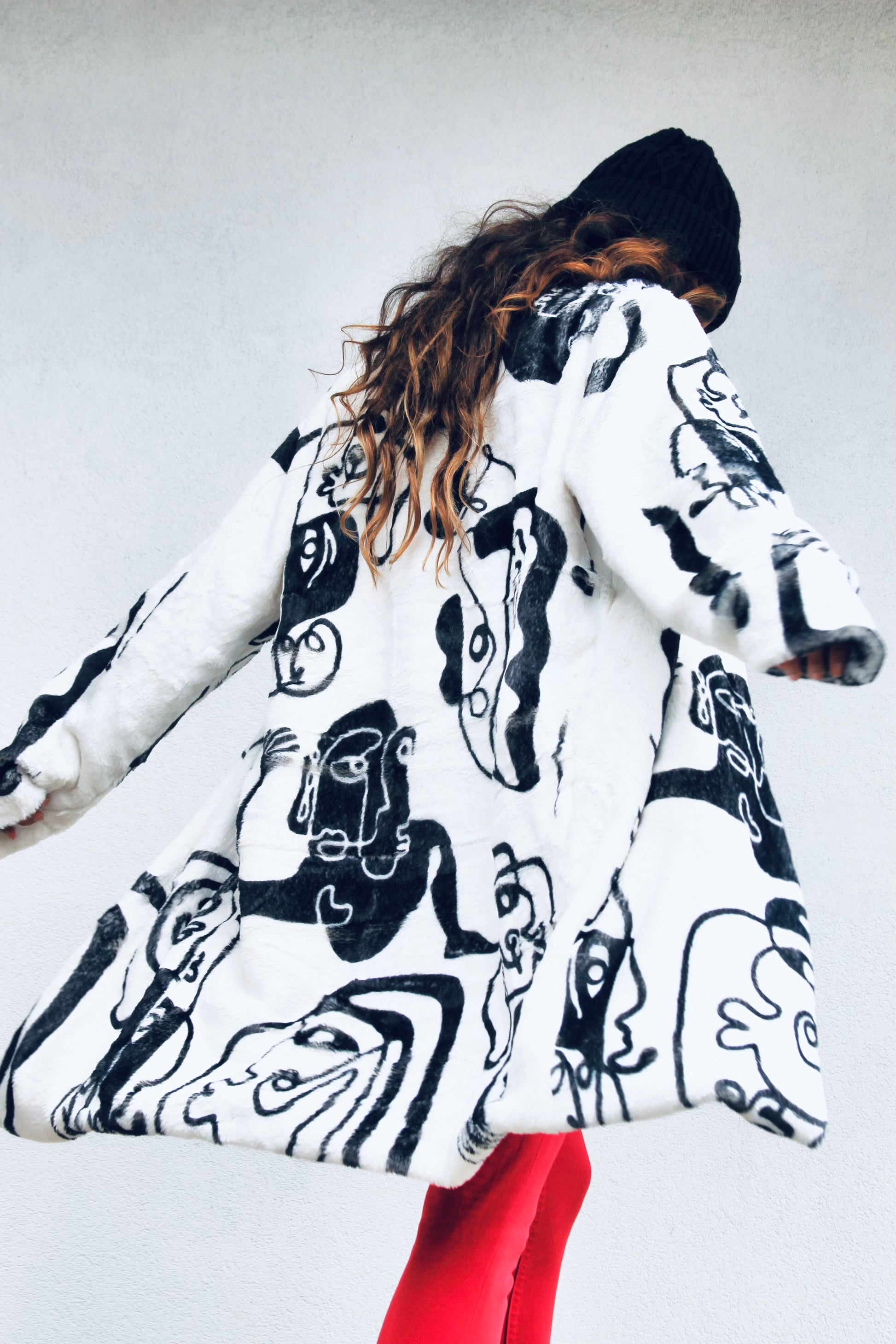 DECO VISAGE super plush + faux fur jacket, size XL>> black + white