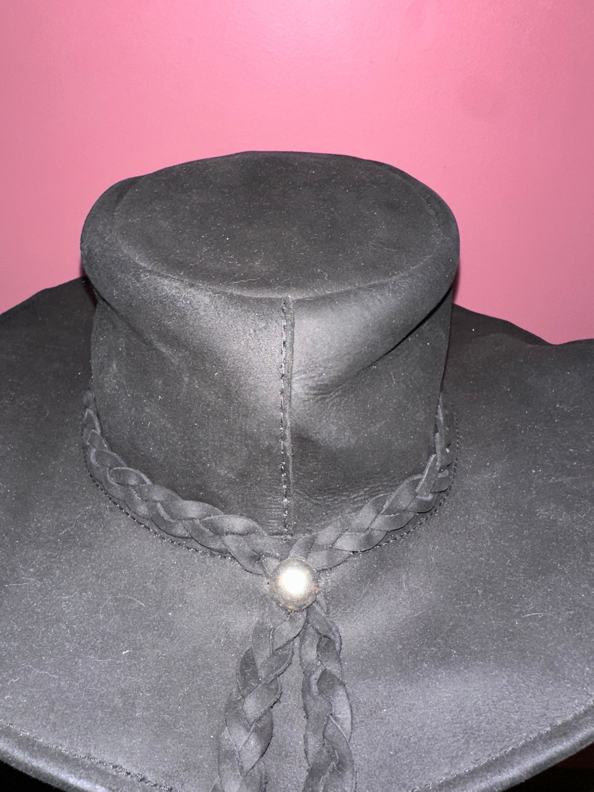 Every girl needs a cowgirl hat in her line-up. Fall is here + it’s time to get dark and moody. Let’s tip our hats to the this sexy black cowgirl hat. Vintage + genuine leather.