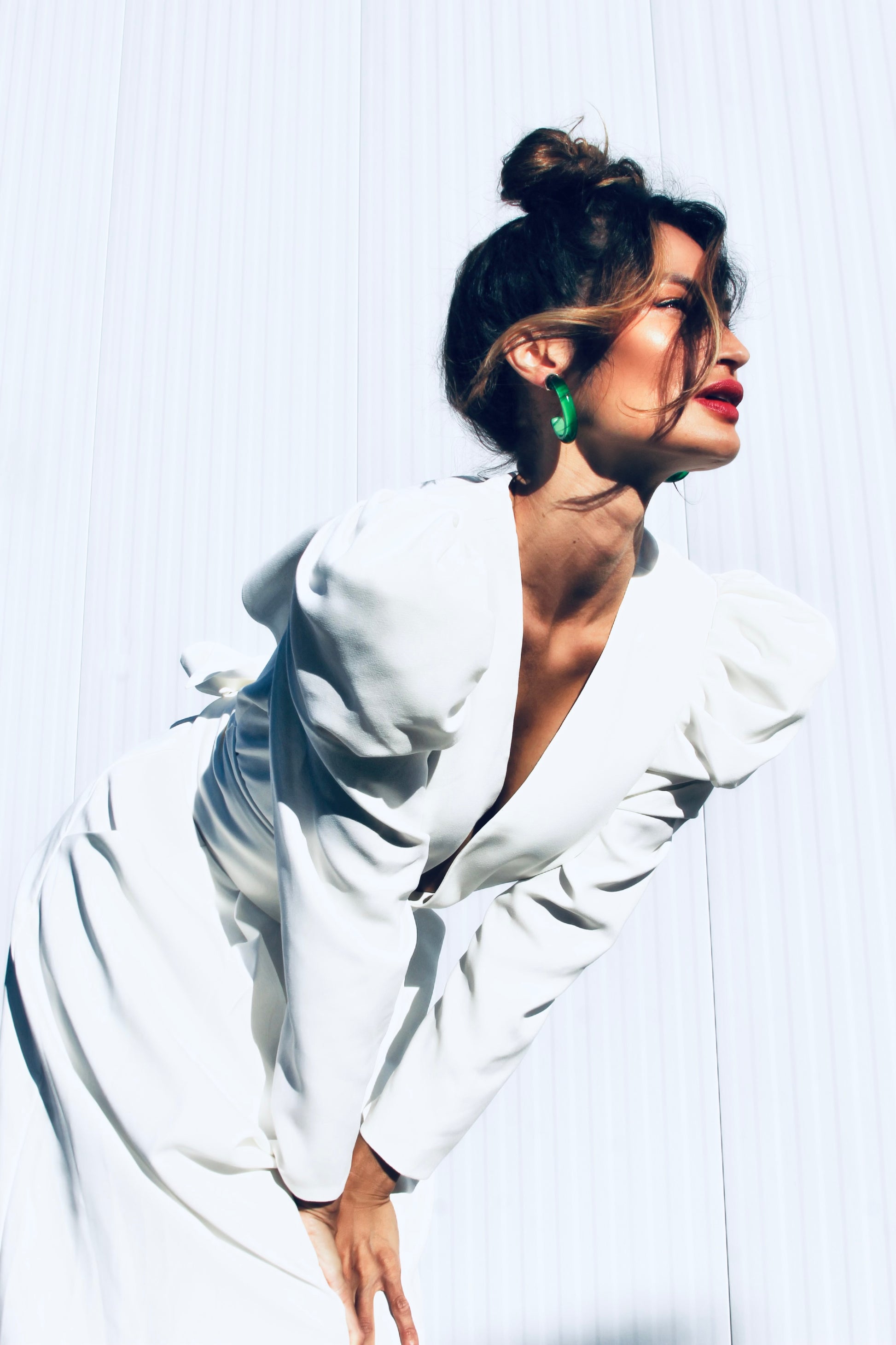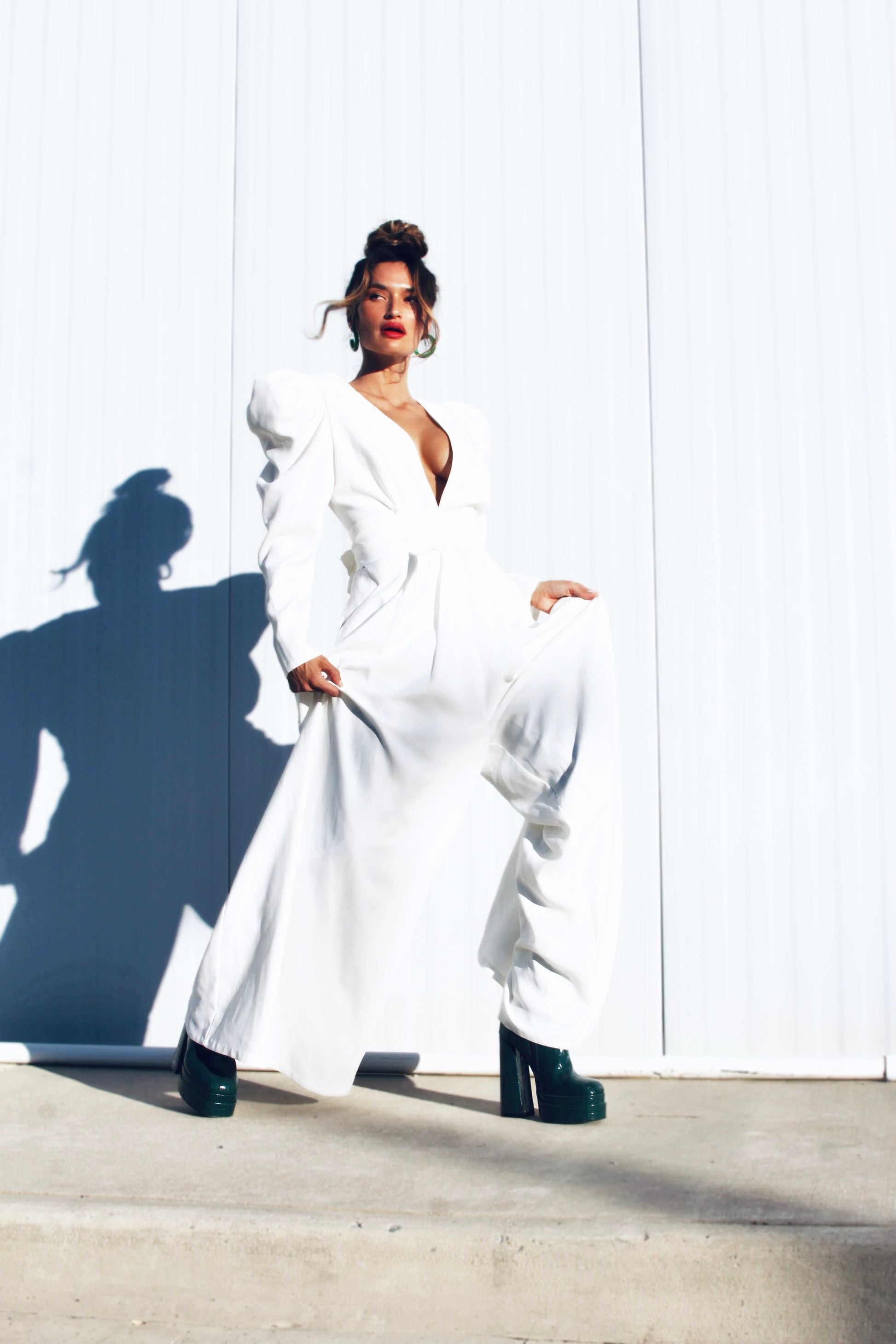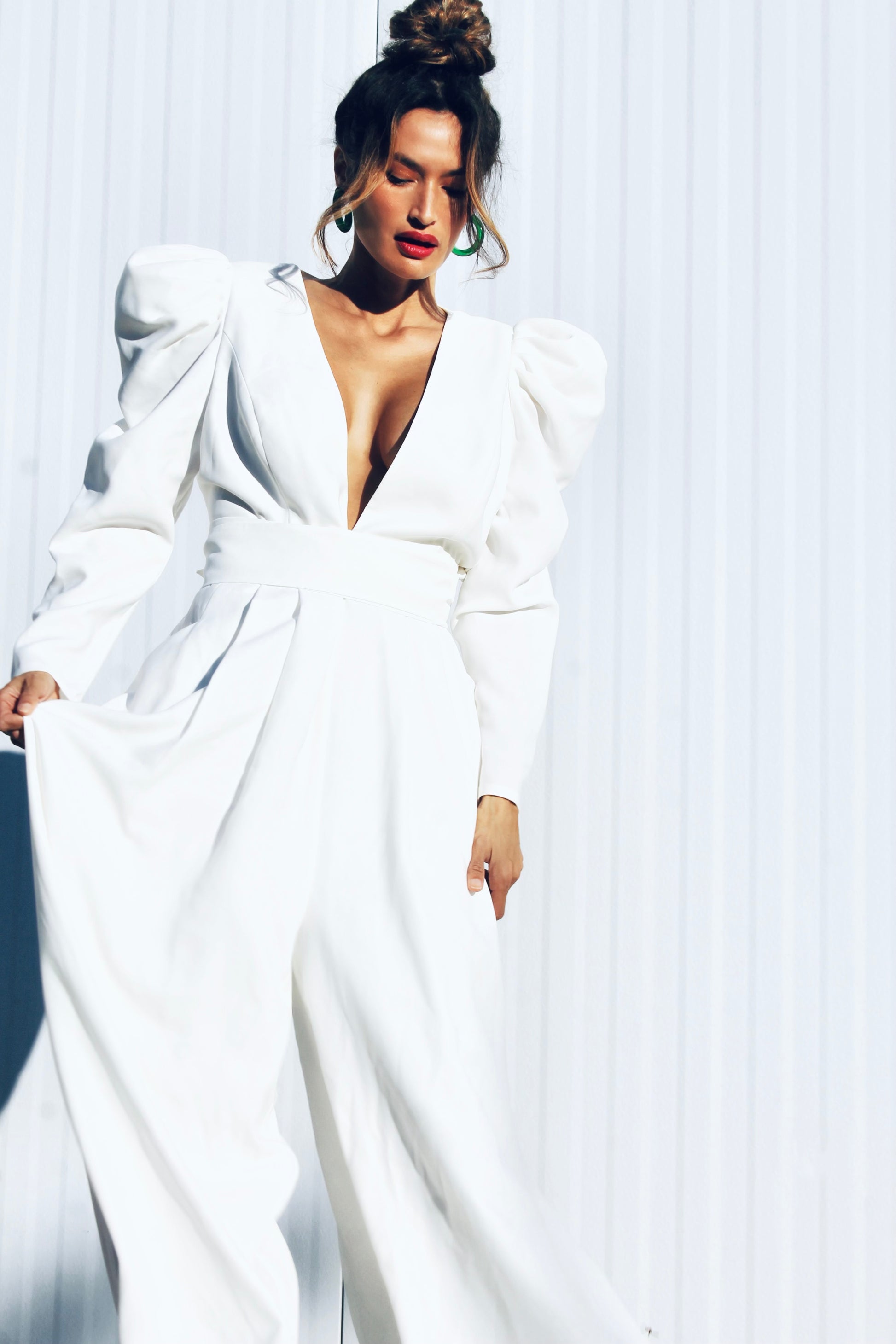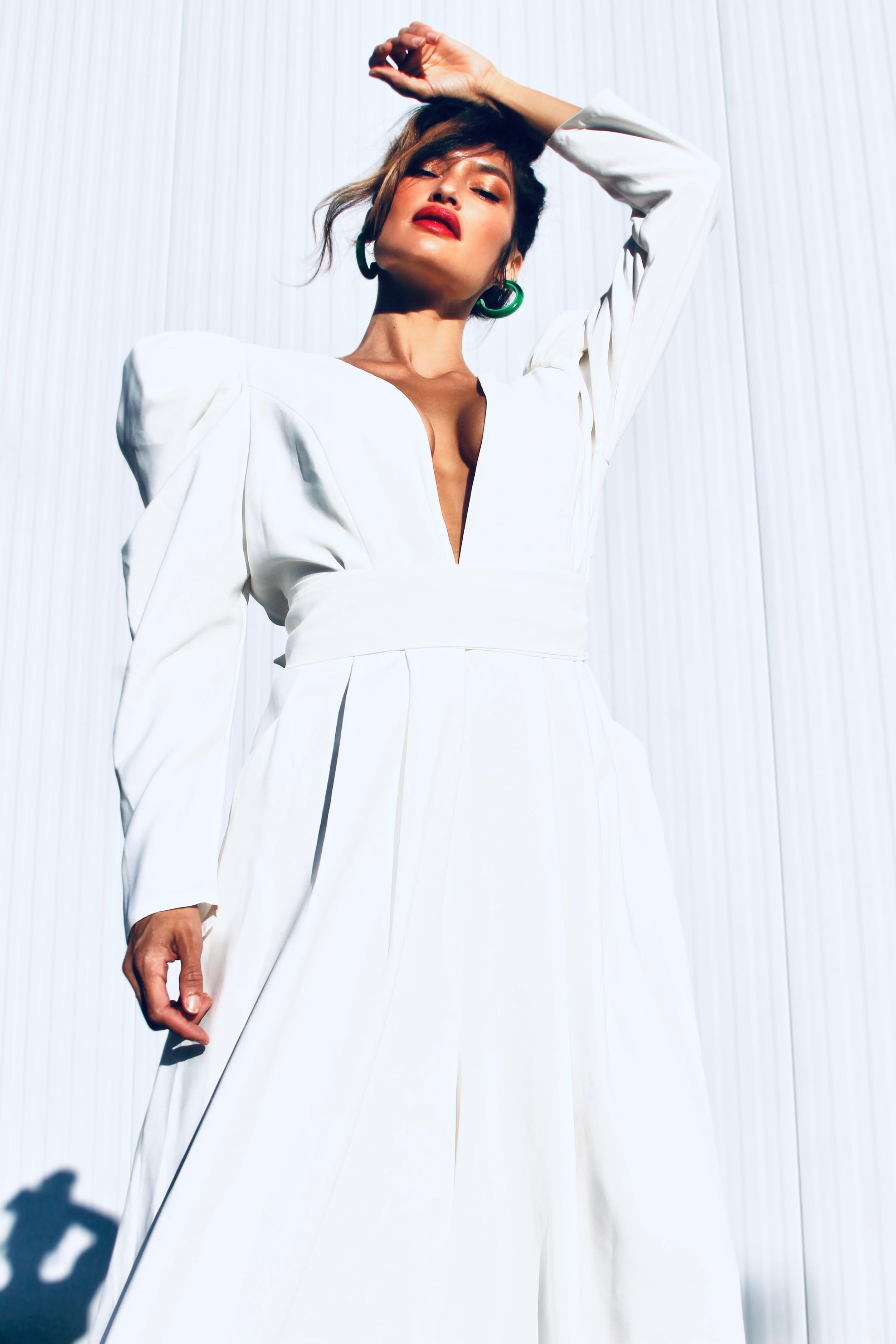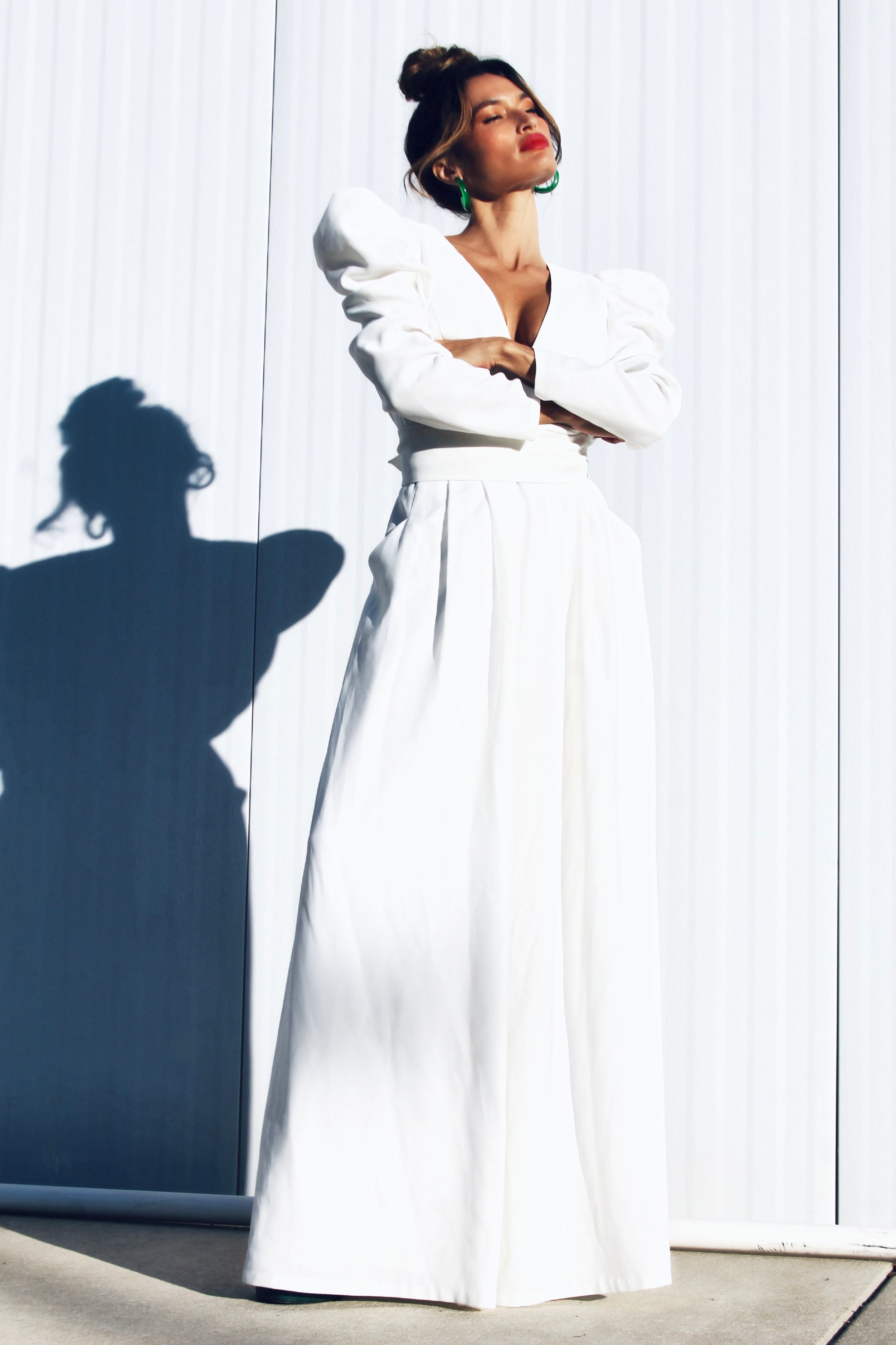 Hi there 👋 don’t mind us…just casually gifting you stunners with shoulders so sharp-  she’ll cut through all the small talk this season 😜 The ultra-defined shoulders create a striking power frame, tapering effortlessly into long sleeves that soften into a statuesque wide leg- blending strength and grace with ease. She is equal parts power play and feminine elegance = our new favorite paradox angels!! Pure white, zero chill and silhouette sharper than your God given wit fable babes 😜