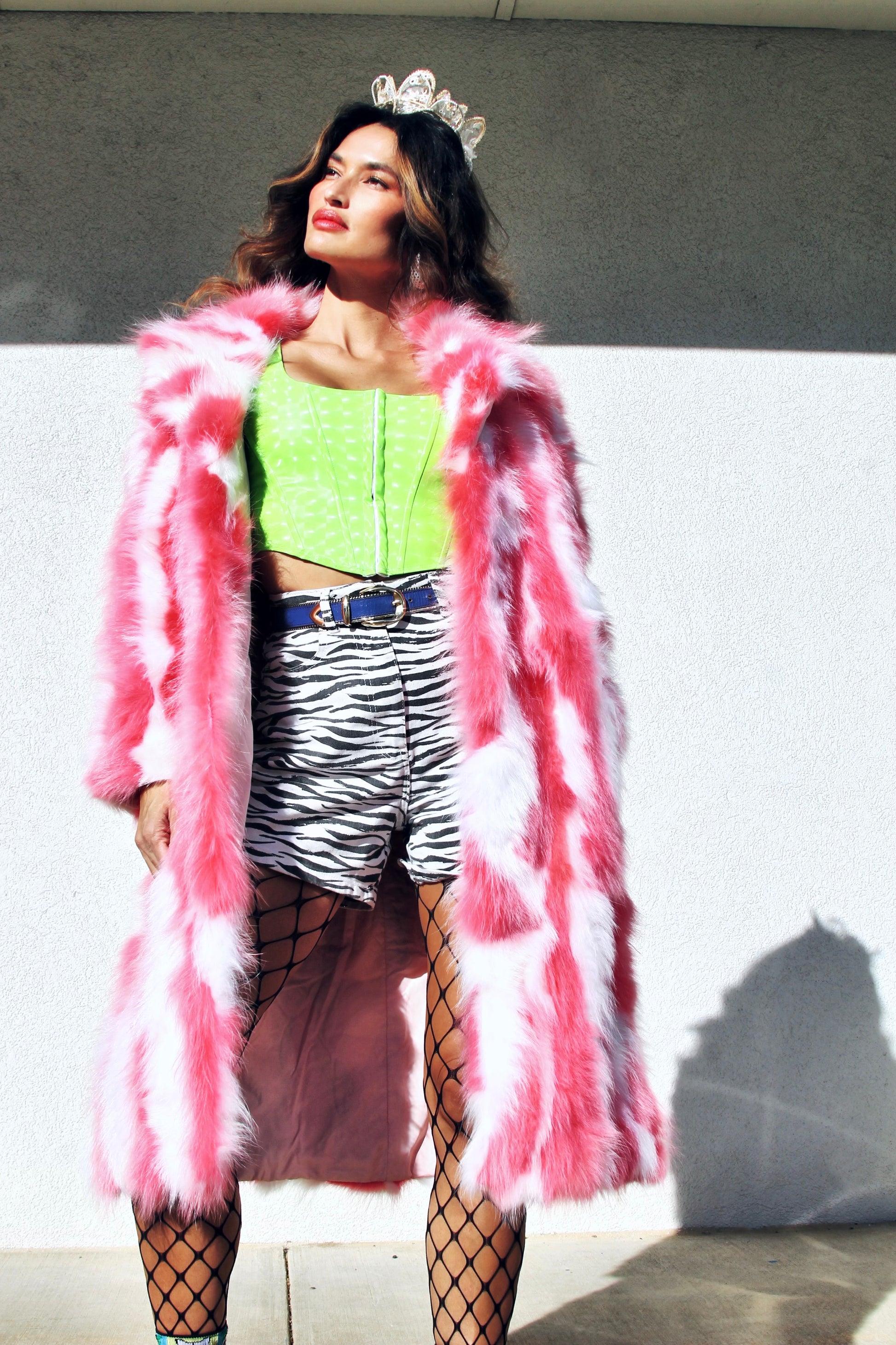 Buckle up buttercups 🤠We may have just found a portal to your most flamboyant dimension yet 🚀 Either I’m hallucinating or we have a psychedelic pink + white- GENUINE FUR COAT on our hands 🤩 Lucky for you, it’s the latter AND the undeniably foxy- FOXY FAVE baby!!  We truly couldn’t believe our eyes when we scouted this treasure and are quite sure we will never find another like her.  It’s like she time traveled-straight out of a disco daydream -> right into our line up 😜 Hope you’re ready for some extra long stares fabies 👀 cause we stay fabulously EXTRA and we don’t GIVE A FLUFF!!Â