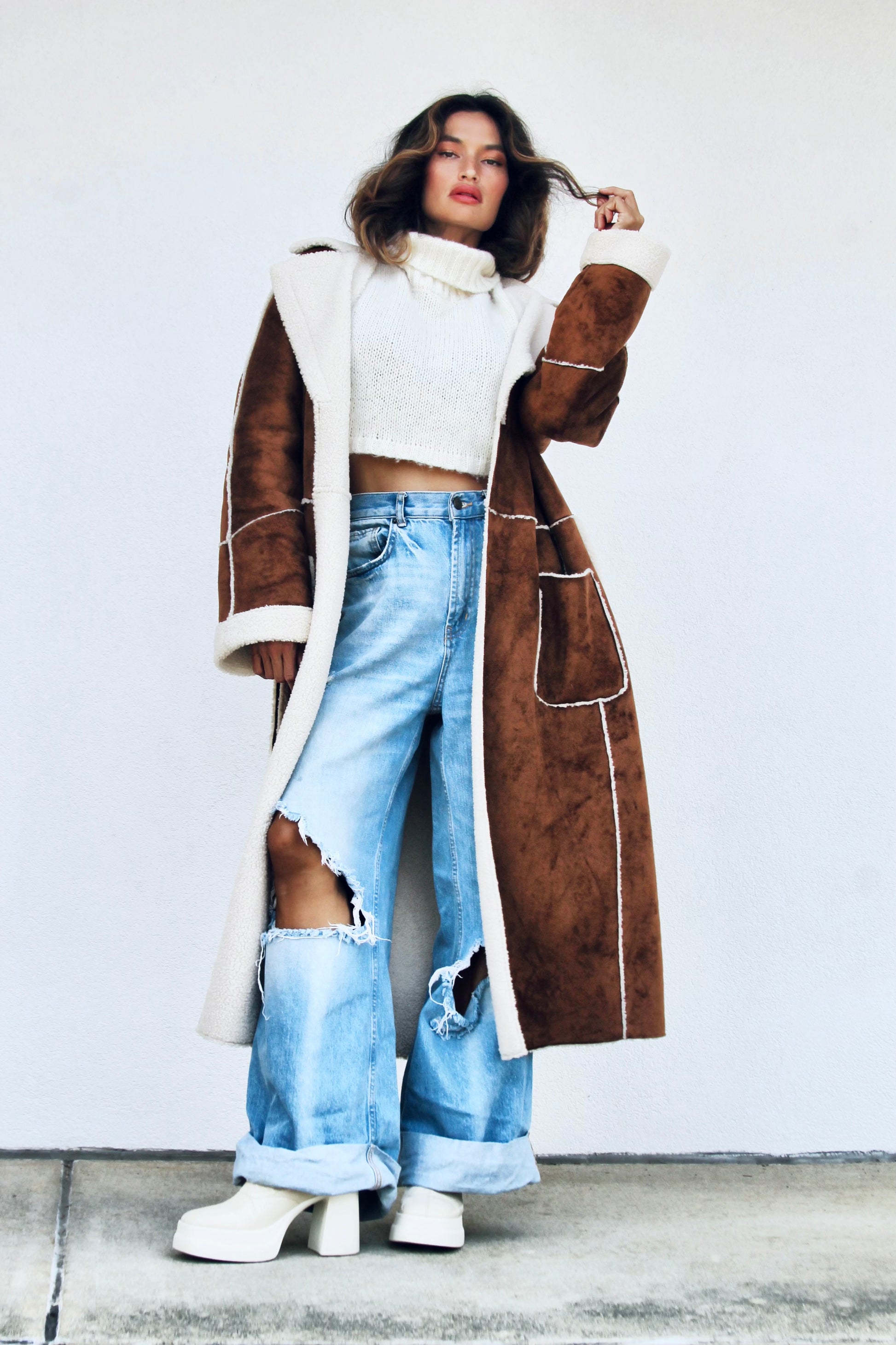 This lavish outerwear piece is crafted from a faux suede exterior + a faux sheepskin interior and features a paneled construction, working belt and a contrast fur lapel collar. Don’t let them tame you, darling 🫶 stay feral with FOXY 😽 It’s CHIC + oh so comfortable!