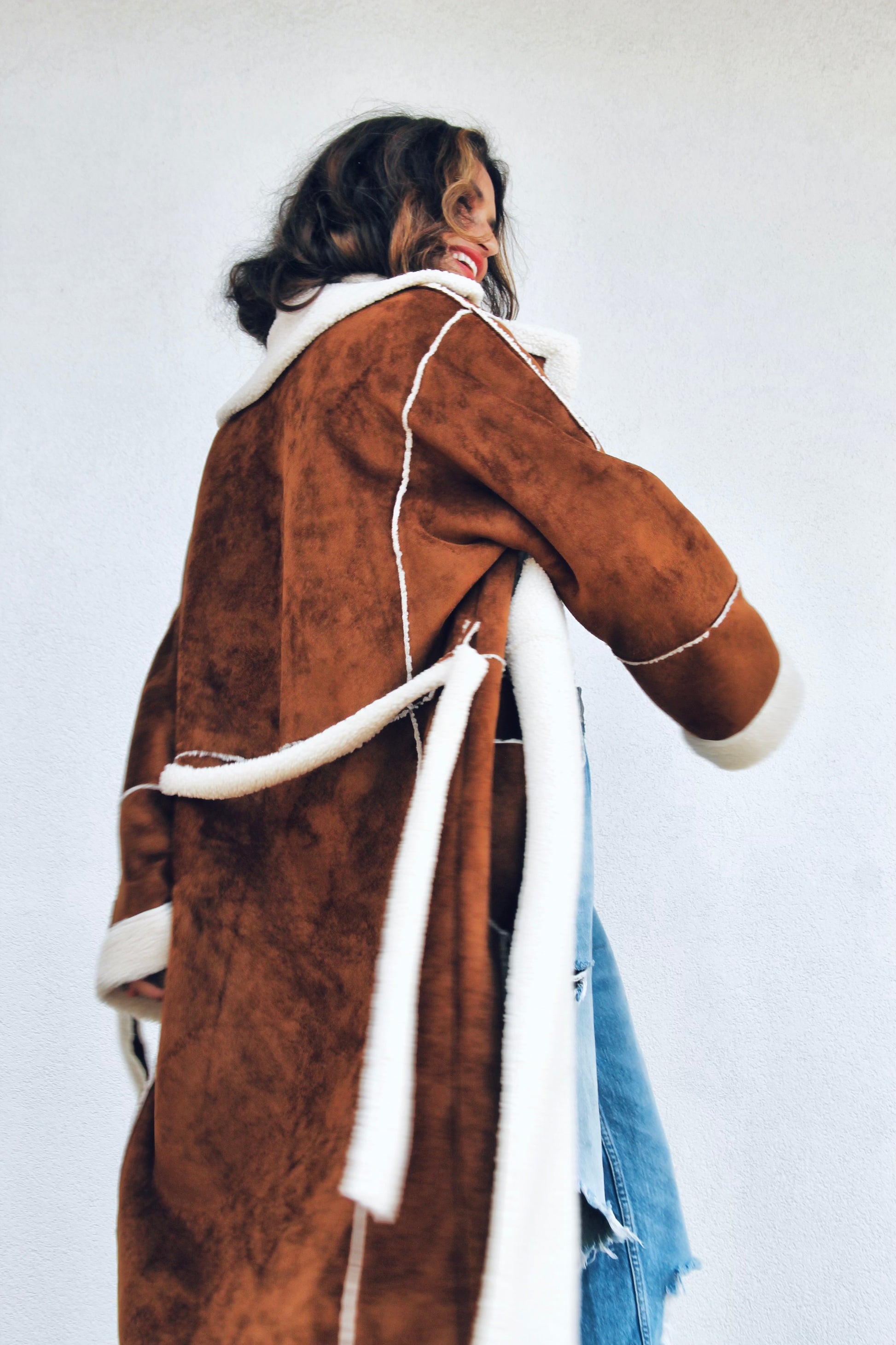 COZY MOMENTS faux suede sheepskin coat, large >> chestnut